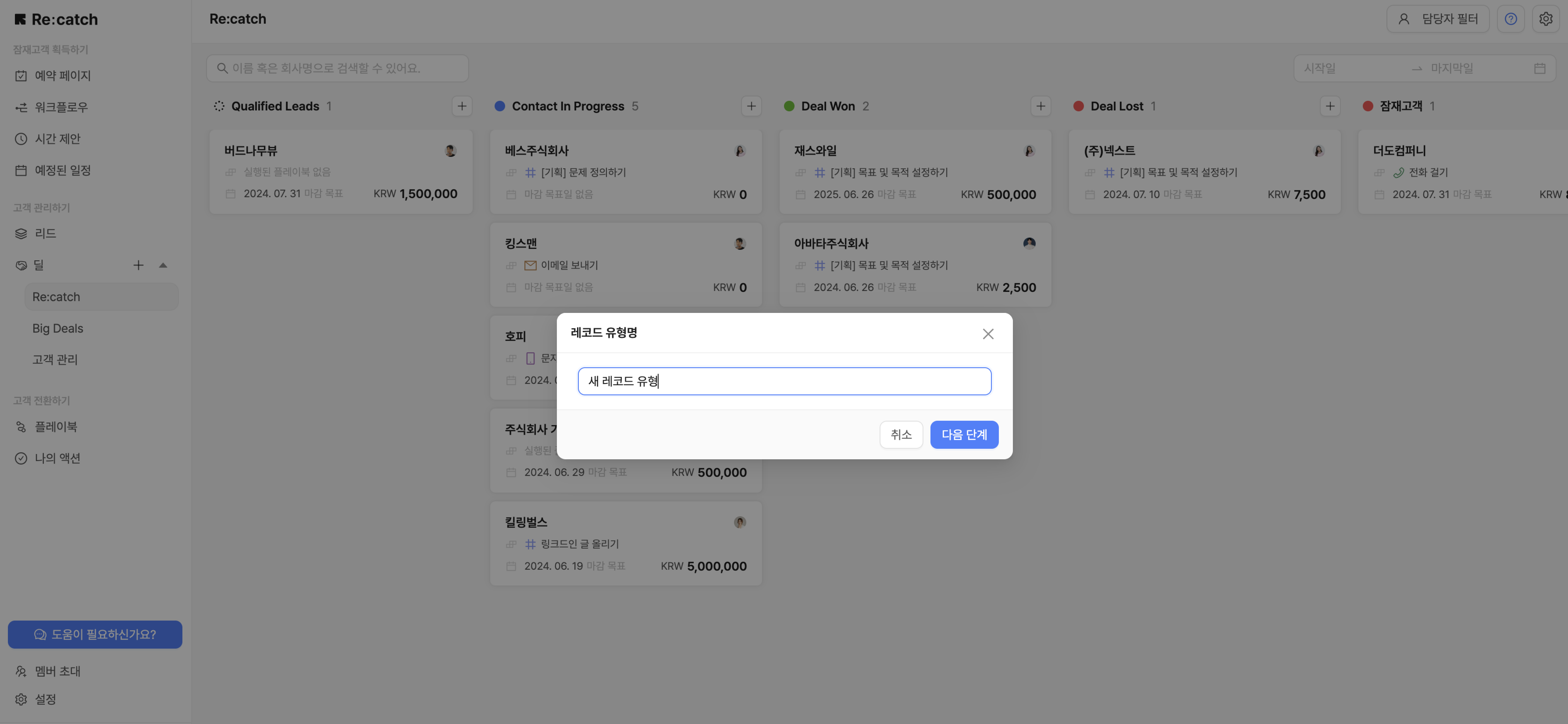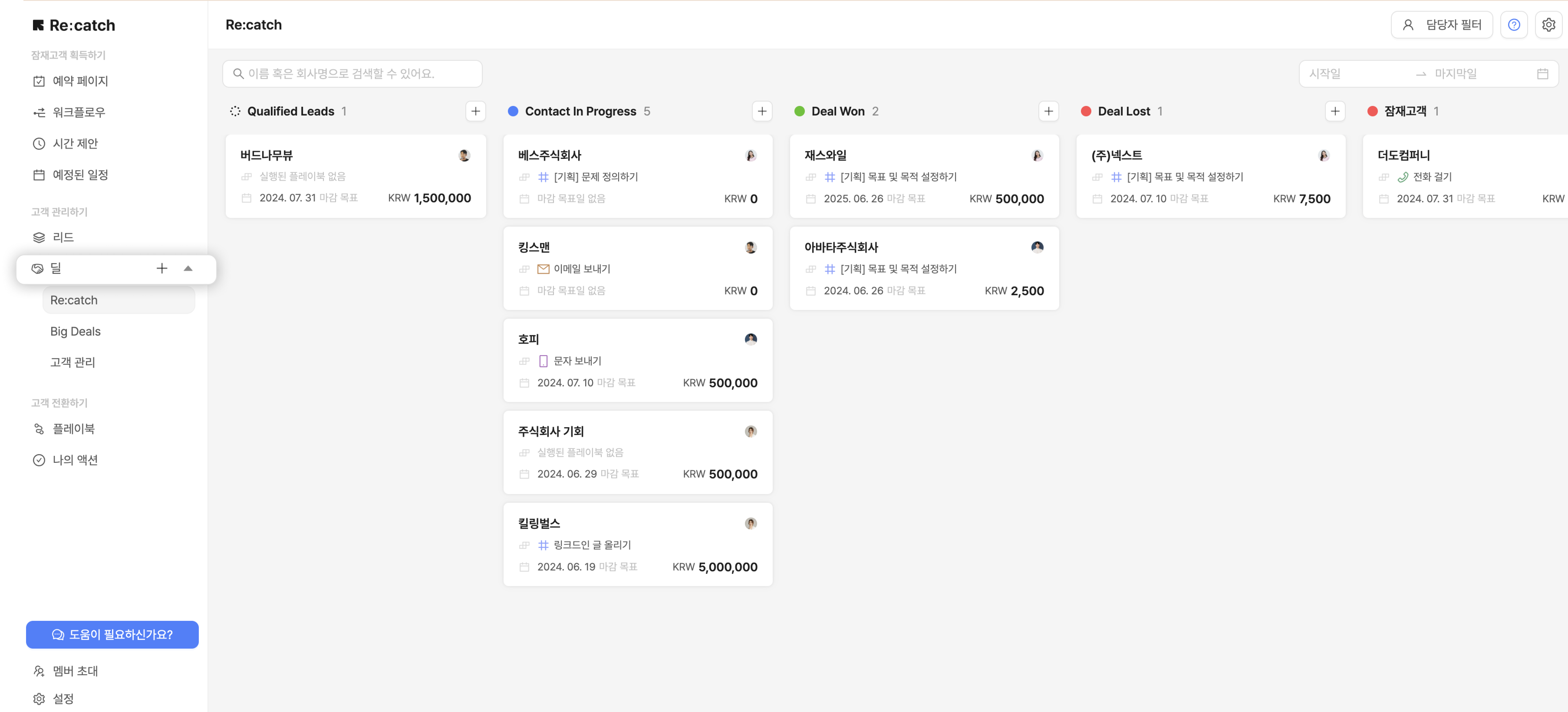 '리캐치'라는 딜 유형에서는 <Qualified Leads>, <Contact in Progress>, <Deal won>, <Deal Lost>, <잠재고객> 이라는 5가지 단계로 딜을 구분하여 고객의 정보를 관리하고 있습니다.
